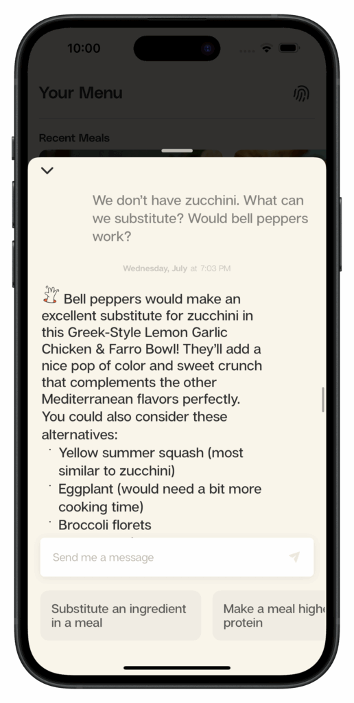 The challenge is flexibility: you need recipes that adapt to substitutions. Ollie handles this by letting you swap ingredients quickly. If broccoli was on your plan but zucchini is half the price, Ollie adjusts recipes instantly so you don’t have to rethink the entire week.