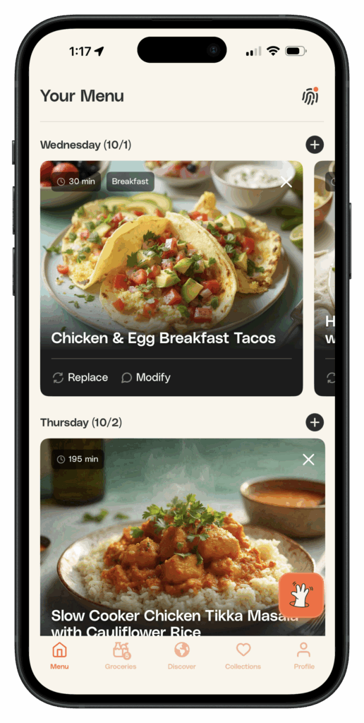 When breakfast, lunch, and snacks all live in one place, meal planning suddenly feels doable. Ollie brings them together into a single weekly plan that fits around school schedules, soccer practice, and tired weeknights.