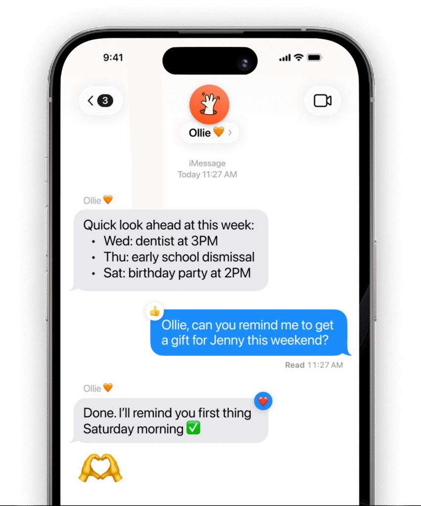 Ollie works entirely through text messages so there’s nothing to download. It works on any phone, right in your messaging app.