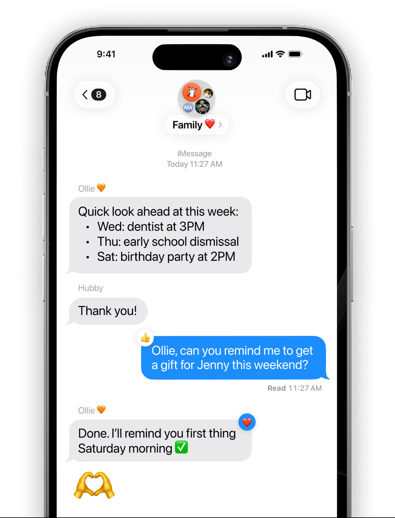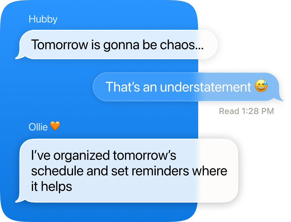 Ollie is an AI assistant that lives right in your family text thread and helps coordinate your life together. No new app to check. No nagging. Just quiet, helpful support right where life happens.