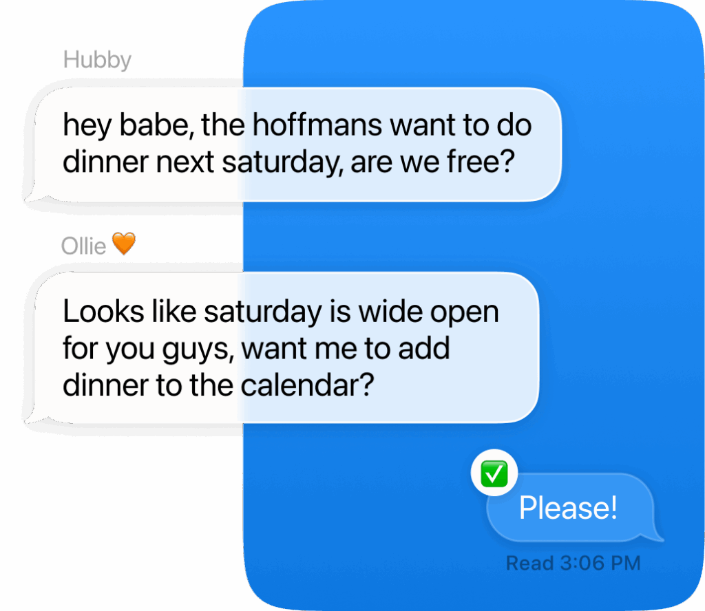 Start a text with Ollie. Invite anyone else in your home. Connect your Google calendars and share those to-dos filling your head. Ollie will take them on. It’s really that simple.