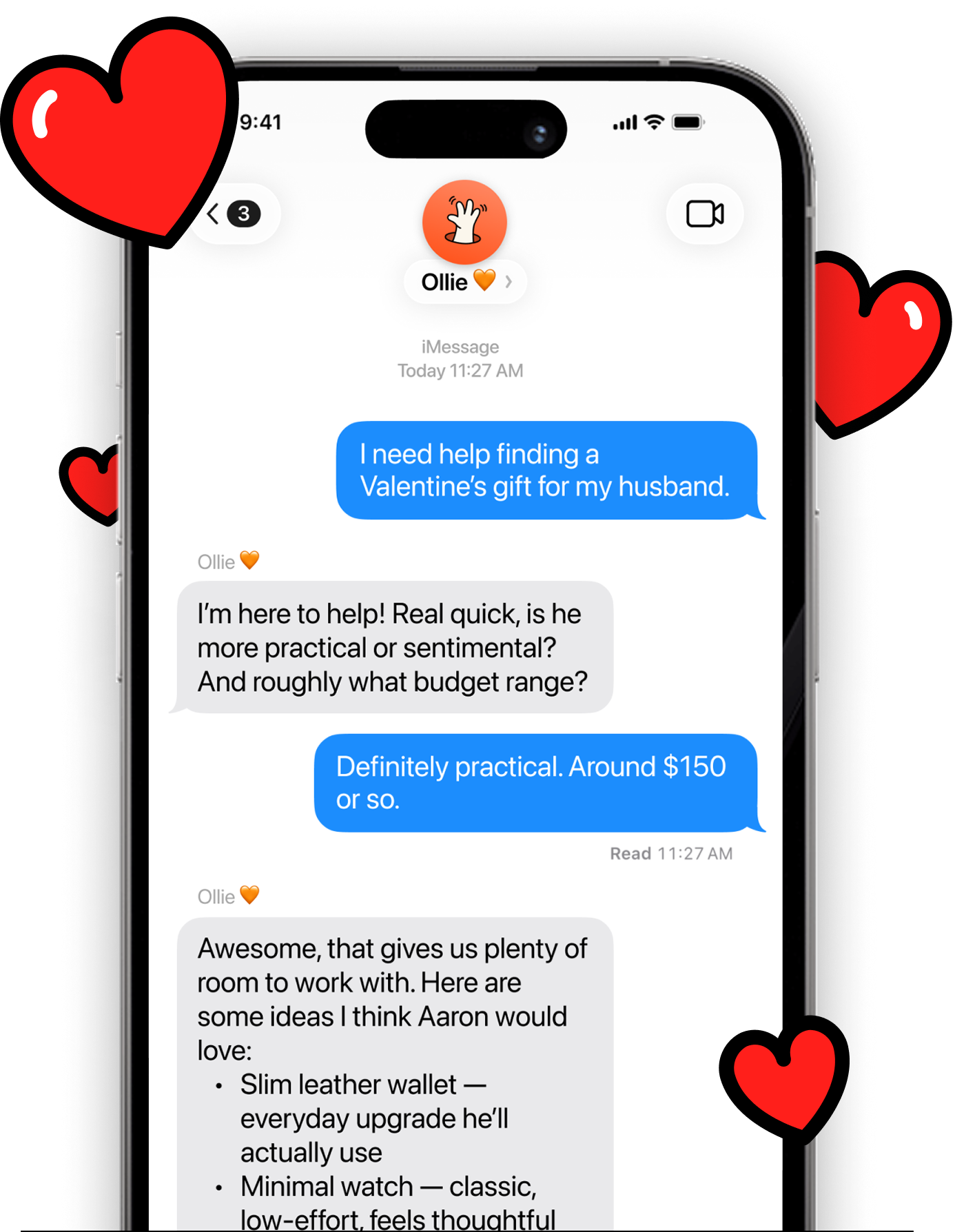 Ollie lives in your text messages and helps you find gift ideas that feel personal and thoughtful, without navigating ads, bias, or generic lists.