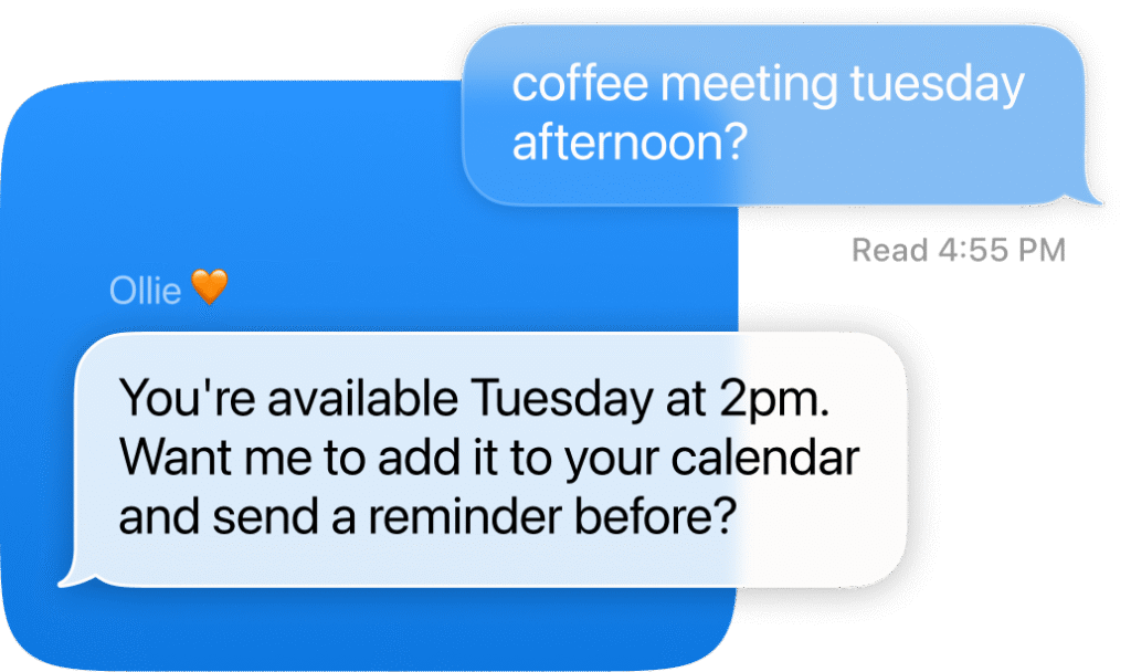 Start a text with Ollie. Connect your Google calendars and share those to-dos filling your head. Ollie will take them on. It’s really that simple.