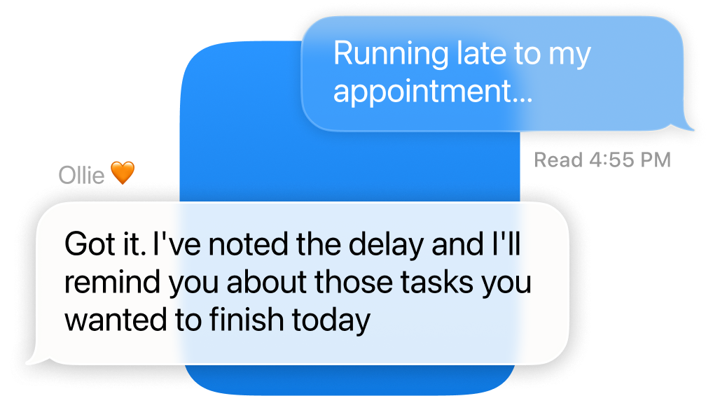 Ollie lives in your text messages and handles reminders and logistics that slip through the cracks — from everyday errands to conditional follow-ups that calendars and alarms miss.